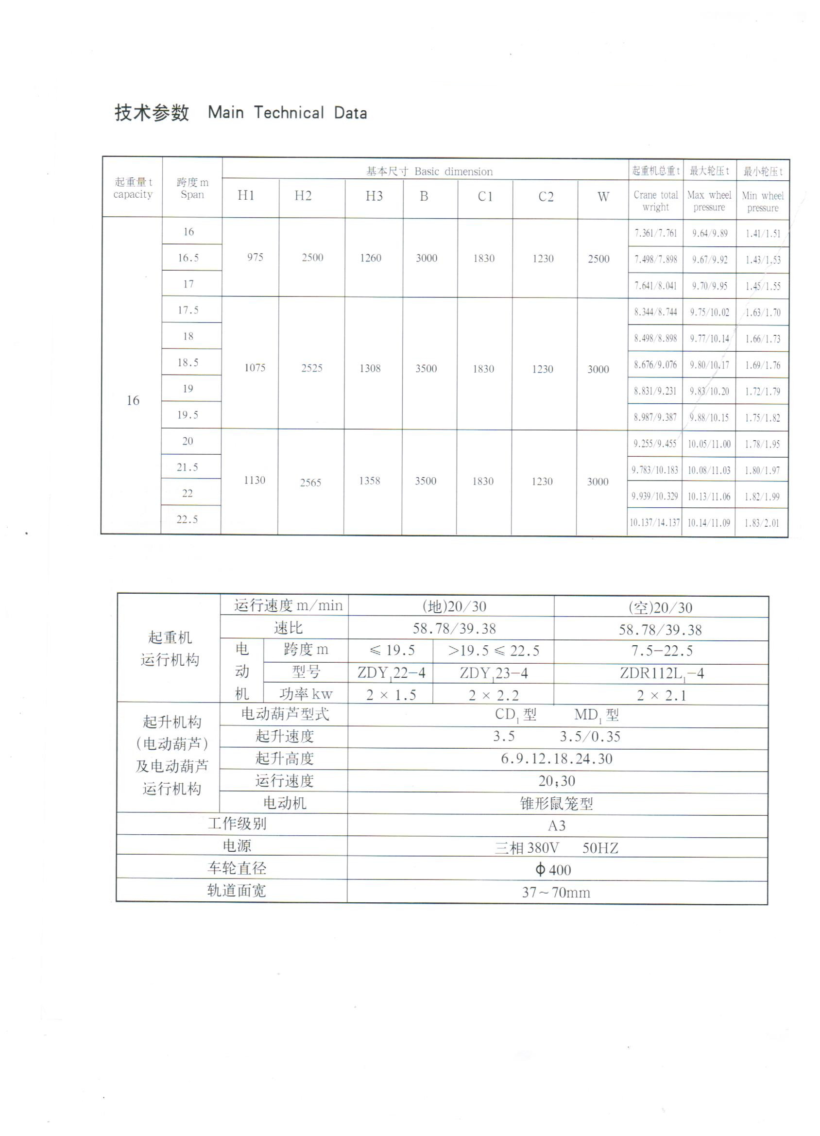 1.2.3 電氣設備 本產品所運行電機為單速異步電動機,運行速度:地面操作20m/min、30 m/min;操縱室作為45 m/min、60 m/min、75 m/min。起重機設有安全裝置,可靠性高。