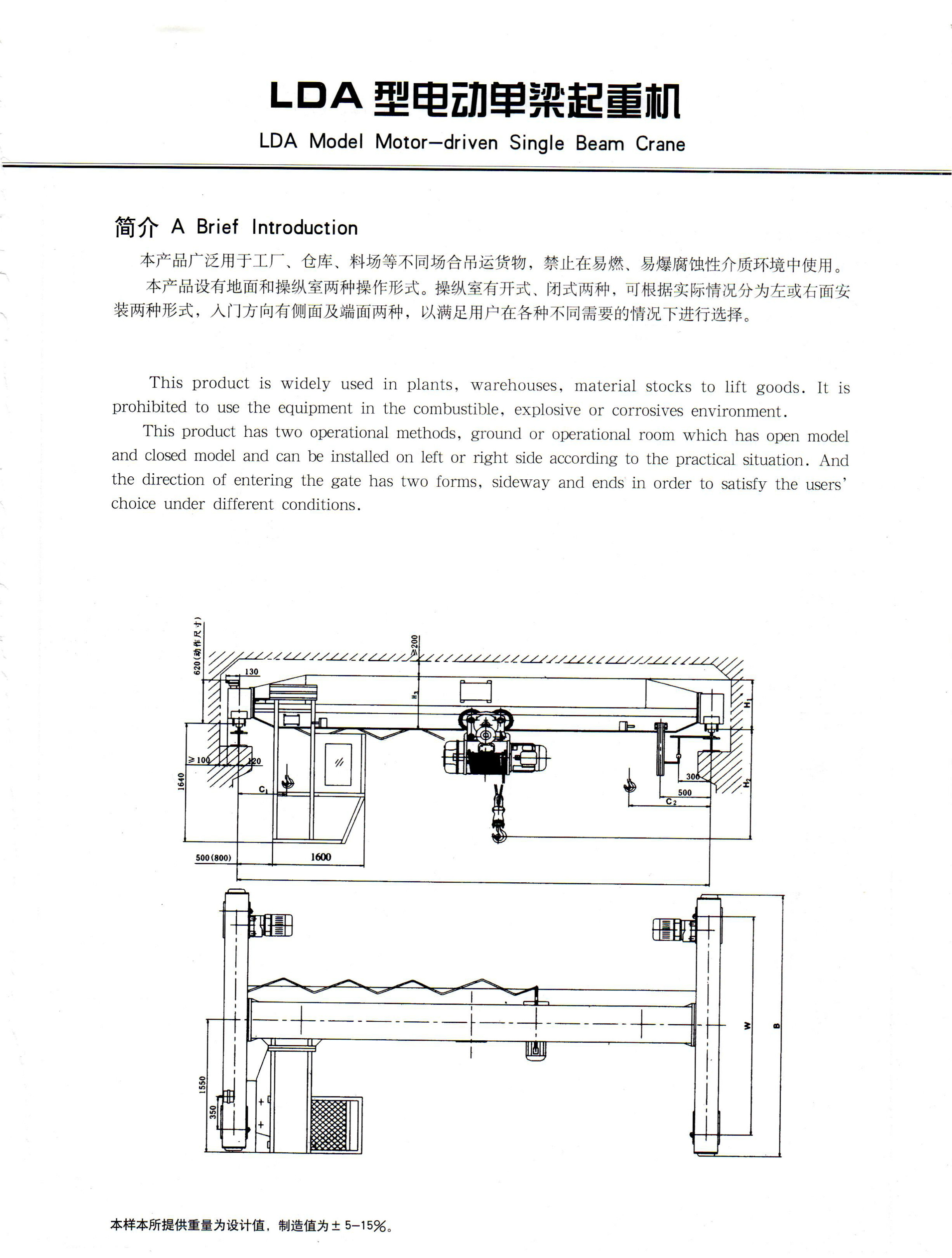 LD-A型電動單梁起重機(以下簡稱起重機)是按JB/T1306-1994標準設計制造的,與CD1、MD1等形式的電動葫蘆配套使 用,成為一種油運行軌道的輕型起重設備。其額定載荷1t~10t;跨度7.5m~22.5m,適應溫度-25℃~+40℃,濕度≤85﹪,無火 災,爆炸危險和腐蝕性介質環境中工作,禁止吊運熔化金屬,有毒、易燃、易爆物品。 為方便用戶,設有地面和操縱室兩種操 縱形式,操縱室又設有端面及側面開門兩種形式,供用戶選擇使用。 本產品廣泛用于機械制造,裝配,倉庫等場所。